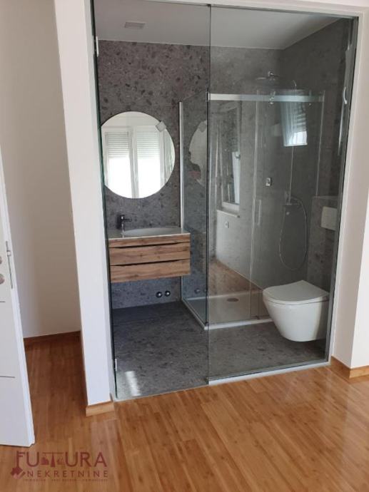 Sastoji se od: tri spavaće sobe, dnevnog boravka + kuhinja + blagovaona, dvije kupaonice, wc-a, ostave, spremišta, lođe i terase.