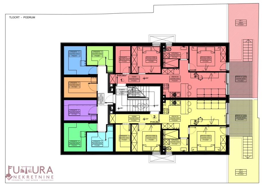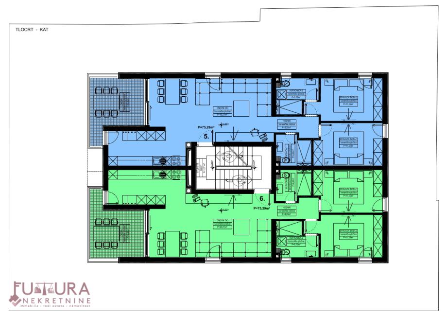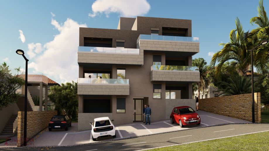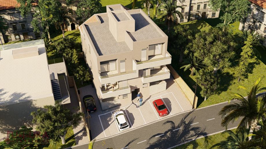 Sastoji se od: dvije spavaće sobe, dnevni boravak + kuhinja + blagovaona, hodnika, dvije kupaonice i terase.