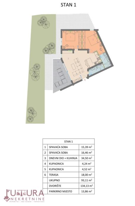 Posjeduje parkirno mjesto i vrt od 134,13 m2.