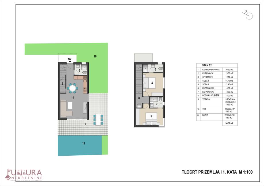 - kat: dvije spavaće sobe i dvije kupaonice.