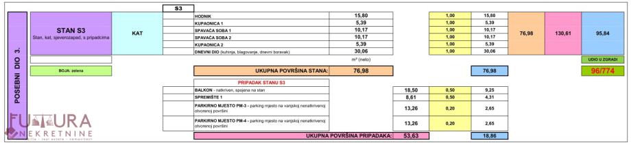 Posjeduje dva parkirna mjesta i spremište od 8,61m2.