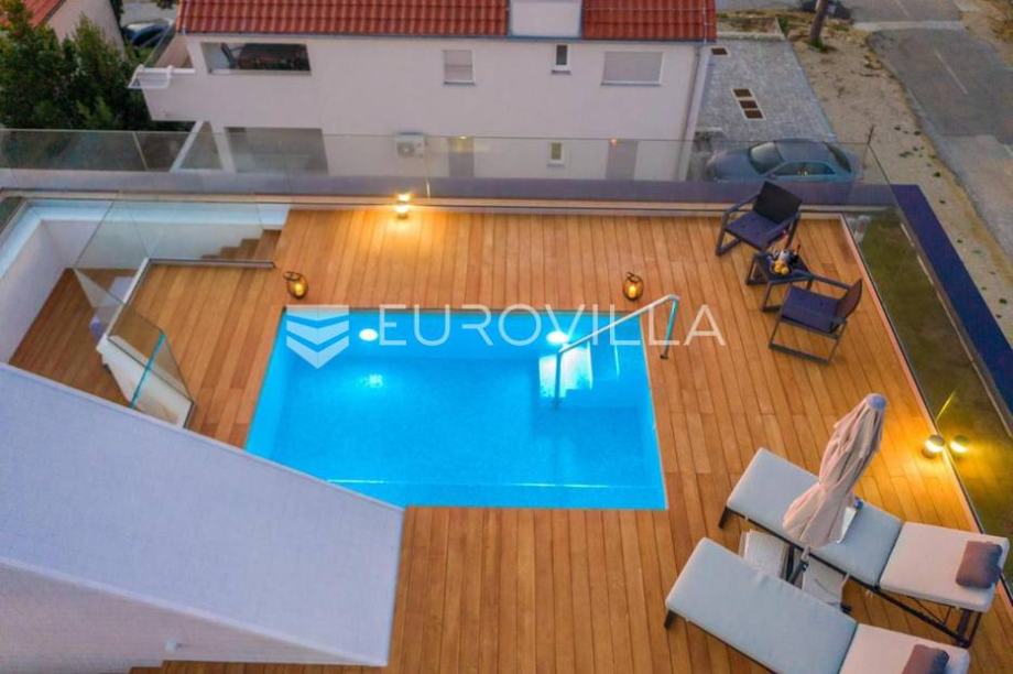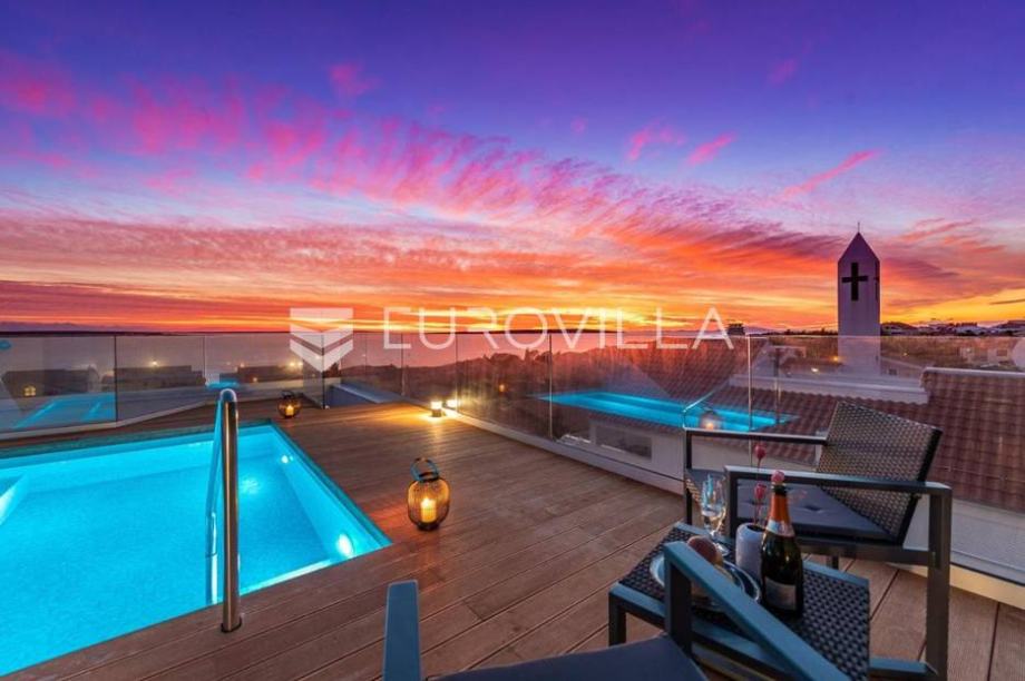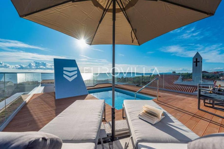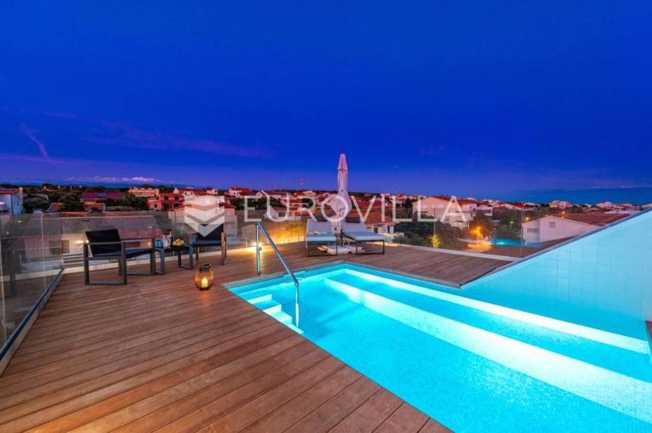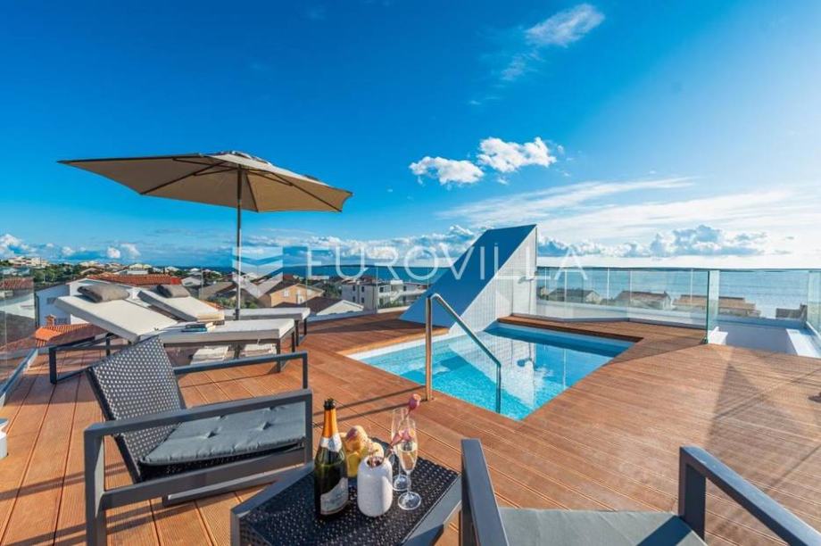 Pag, Mndre, modern, fully furnished house 144 m2. It consists of two bedrooms, two bathrooms, guest toilet, kitchen and dining room, living room, two terraces, two storage room, and there is a terrace with a swimming pool on the roof.The house has two parking spaces and a landscaped garden.This...