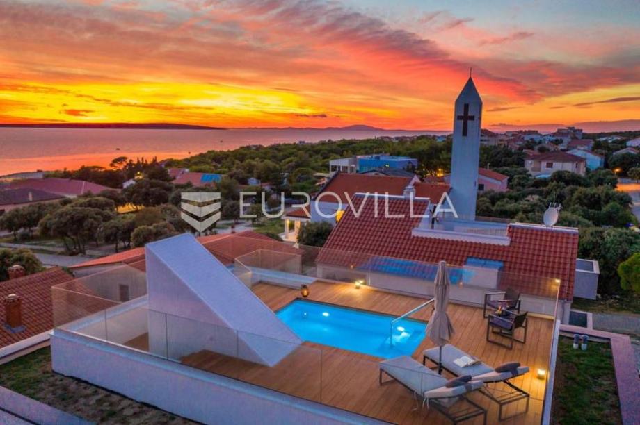 Pag, Mandre, moderna, kompletno namještena kuća, NKP 144 m2.Sastoji se od dvije spavaće sobe, dvije kupaonice, gostinjskog wc-a, kuhinje i blagovaonice, dnevnog boravka, dvije terase, dva spremišta, a na krovu se nalazi terasa s bazenom.Kući pripadaju dva parkirna mjesta, te uređen vrt.Iz ove...