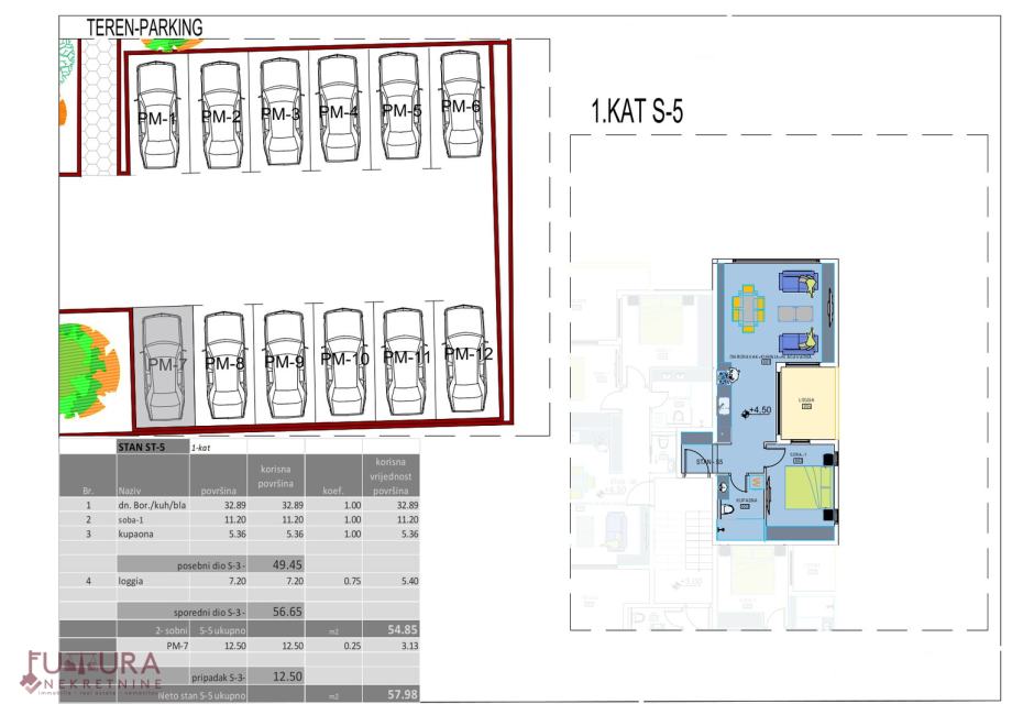 Sastoji se od: jedne spavaće sobe, dnevnog boravka + kuhinja + blagovaona, kupaonice, i lođe.