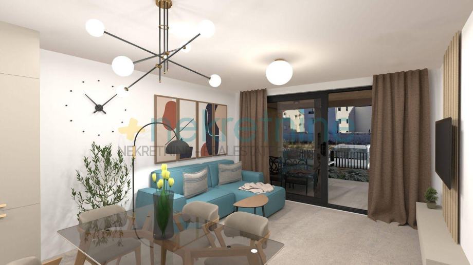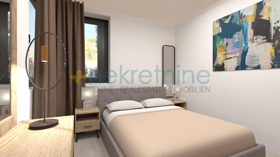 Prodaje se moderno dizajniran dvosoban stan (S6) na drugom katu zgrade sa ukupno šest stanova, smještene u mirnoj ulici novog naselja, svega 350 metara udaljenog od mora i prve plaže.
