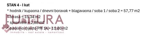 Sastoji se od: dvije spavaće sobe, dnevnog boravka + kuhinja + blagovaona, hodnika, kupaonice i terase.