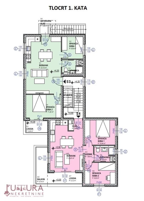 Sastoji se od: dvije spavaće sobe, dnevnog boravka + kuhinja + blagovaona, hodnika, kupaonice i lođe.