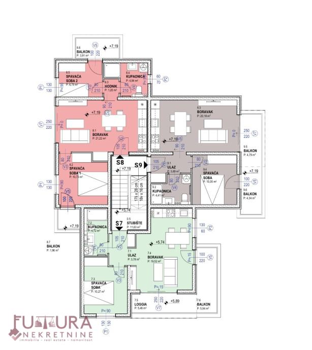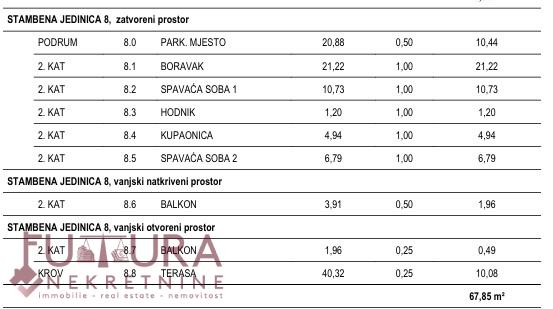 Sastoji se od: dvije spavaće sobe, dnevnog boravka + kuhinja + blagovaona, hodnika, kupaonice lođe i terase.