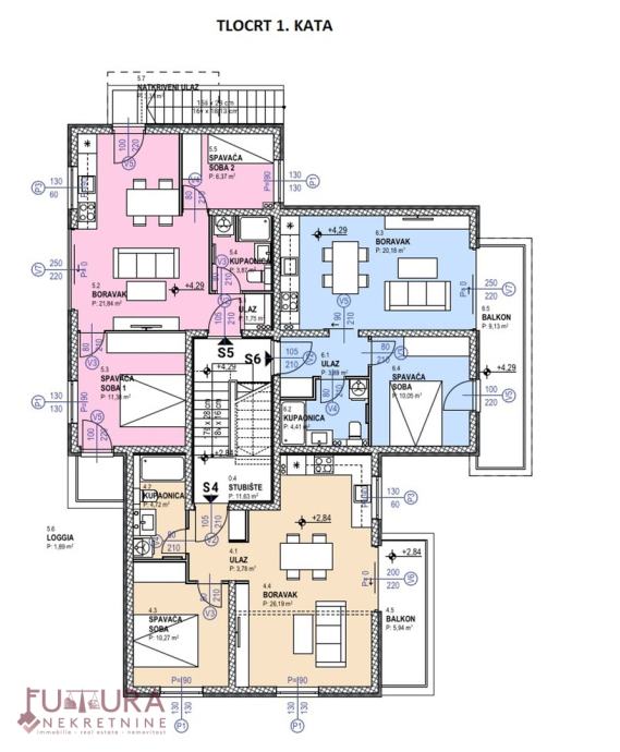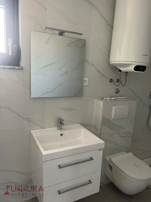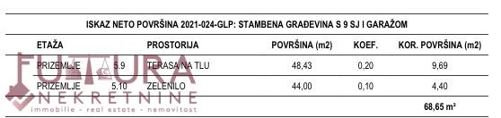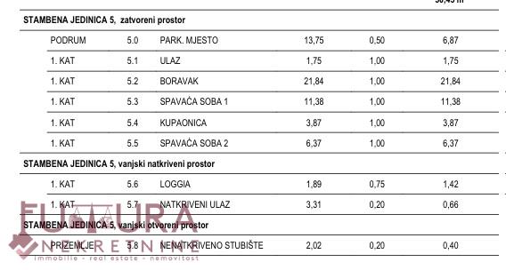 Sastoji se od: dvije spavaće sobe, dnevnog boravka + kuhinja + blagovaona, hodnika, kupaonice lođe i terase.
