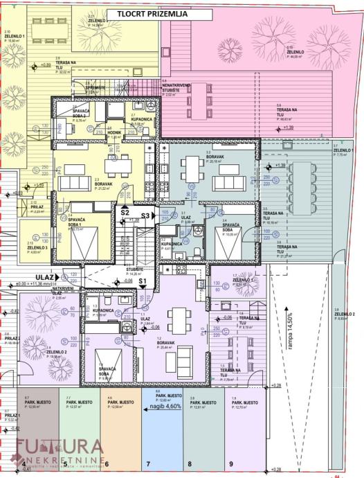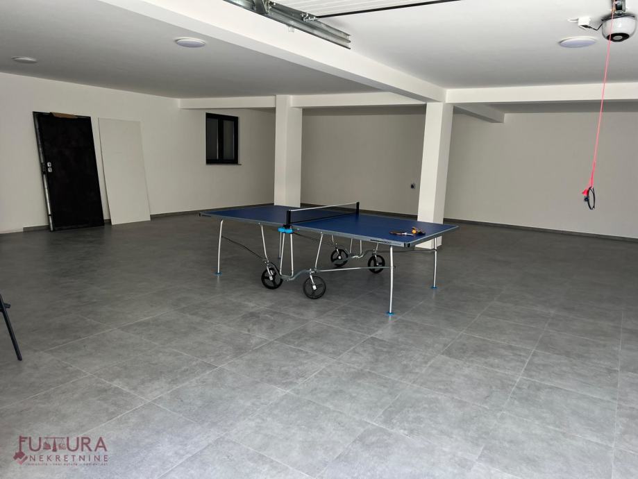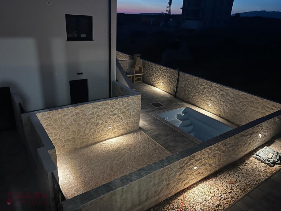 Posjeduje parkirno mjesto koje ima utičnicu za punjenje električnog auta (svaka parkirna utičnica je povezana sa brojilom struje od pripadajućeg apartmana), garažu od 13,75 m2, bazen 7m x 3m i vrt od 44 m2.