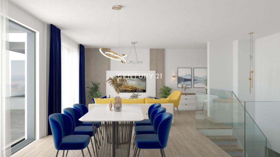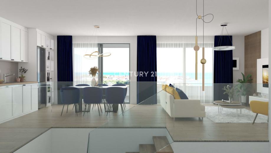 Obzirom da je stan raspoređen na dvije etaže, na prvoj etaži su 2 spavaće sobe sa sanitarnim čvorom, a na drugoj etaži je open space dnevni boravak sa kuhinjom i blagovaonom te sa još jednom prostranom terasom i zasebnom kupaonom.