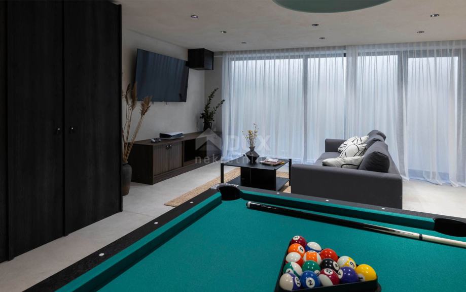 Ova luksuzna novogradnja sastoji se od prostranog dnevnog boravka s kaminom, četiri spavaće sobe od 25 m2, dnevnim boravkom/sobom za zabavu od 40 m2 i velikom terasom s grijanim infinity bazenom od 40 m2 s pogledom na more i prirodu.