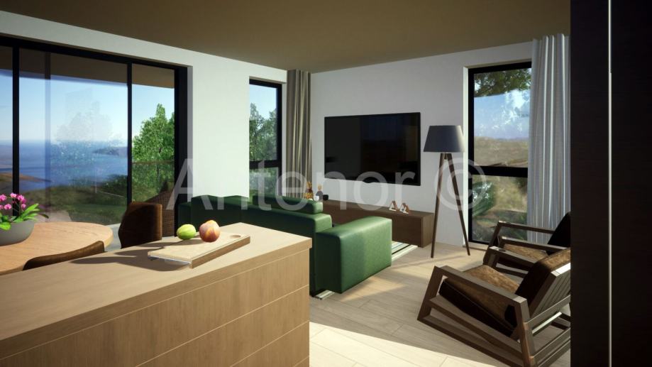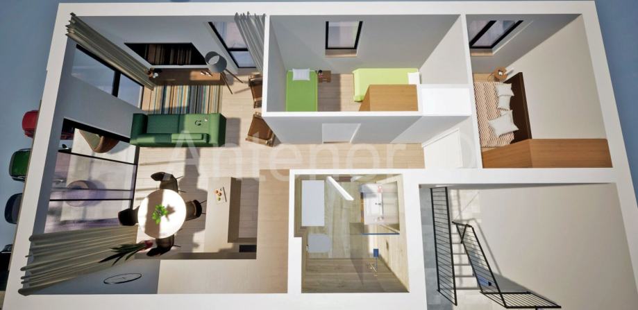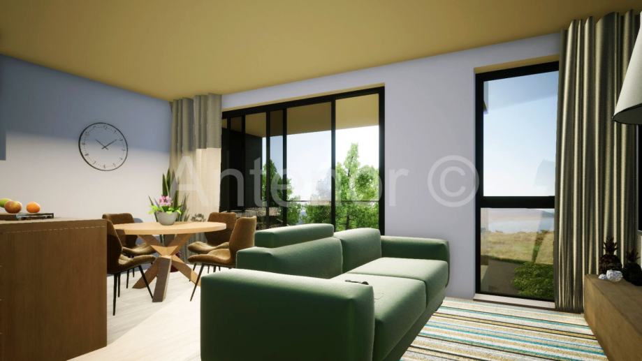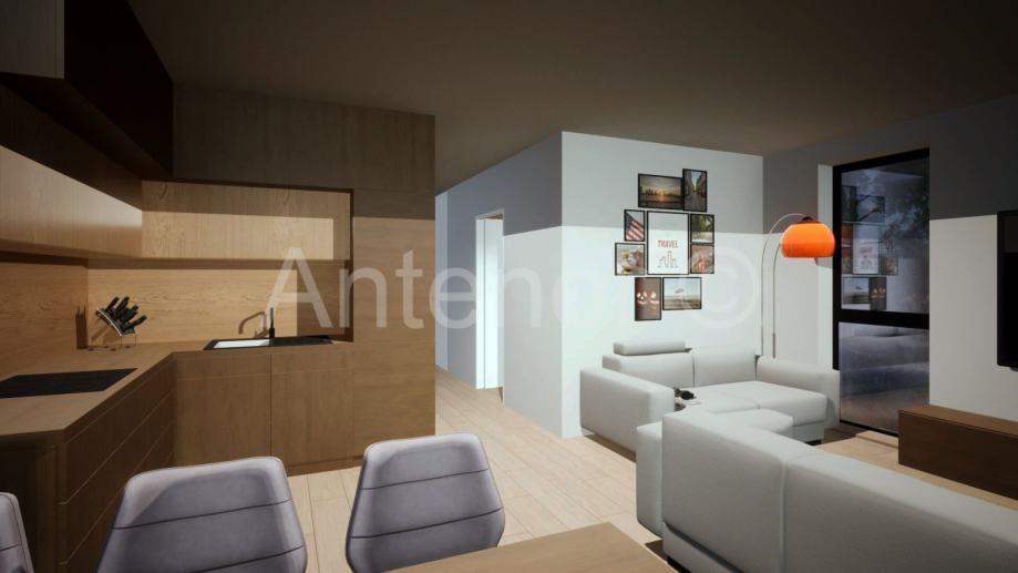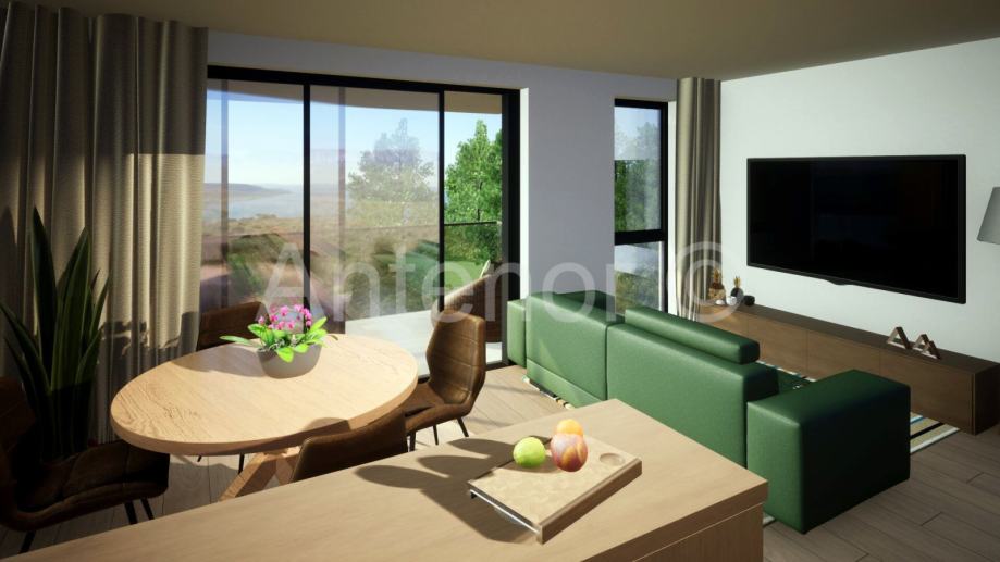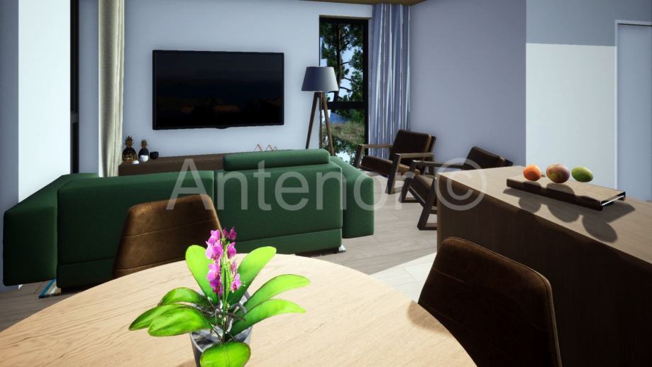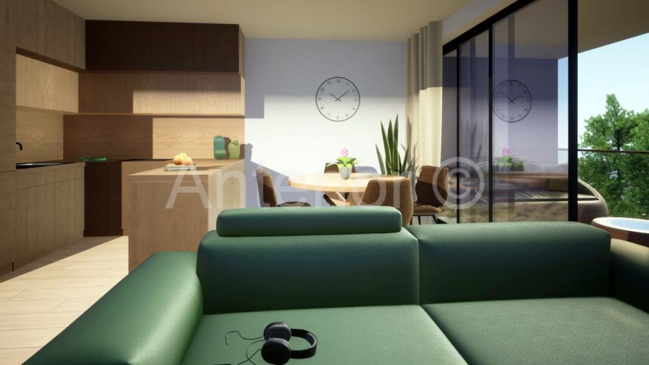 Apartman se sastoji od hodnika, dvije spavaće sobe i kupaonice, te kuhinje, dnevnog boravka i blagavaone te balkona. Ukupna tlocrtna površina apartmana je 62,42 m2. Apartmanu pripadaju i dva parkirna mjesta.
