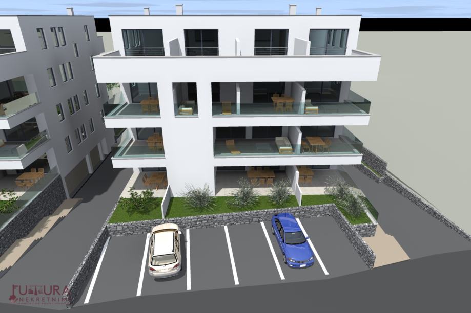 Sastoji se od: dvije spavaće sobe, dnevnog boravka + kuhinja + blagovaona, hodnika, kupaonice i terase.