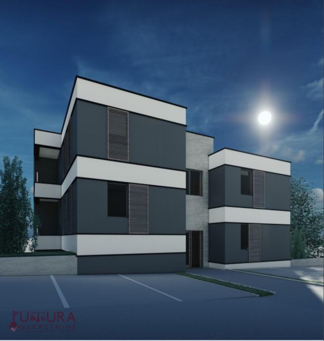 Sastoji se od: dvije spavaće sobe, dnevnog boravka + kuhinja + blagovaona, hodnika, kupaonice i terase.
