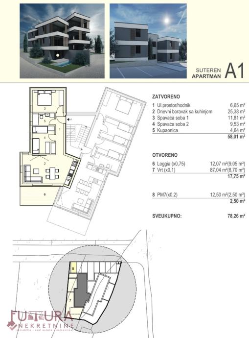 Pag - Šimuni, prodaje se dvosobni apartman od 78,26 m2 u suterenu stambenog objekta sa ukupno šest apartmana izgrađenih 2023 godine.