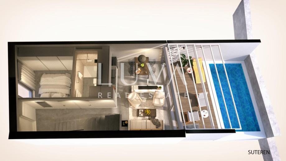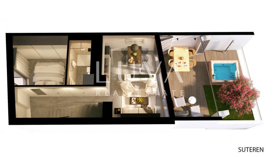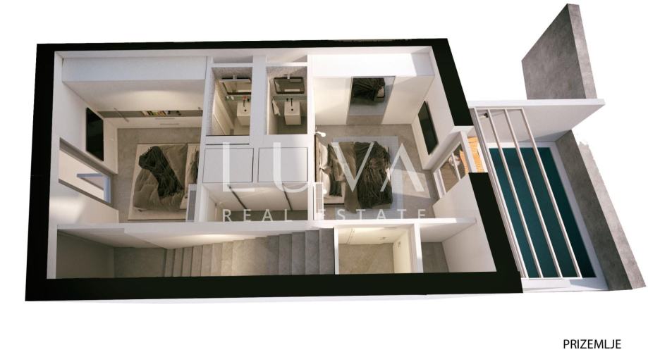 Kuća se sastoji od četiri etaže, a koncipirana je tako da se može podijeliti na dva zasebna funkcionalna apartmana.