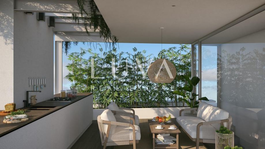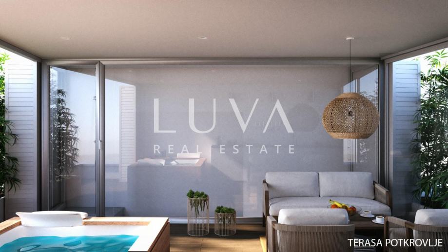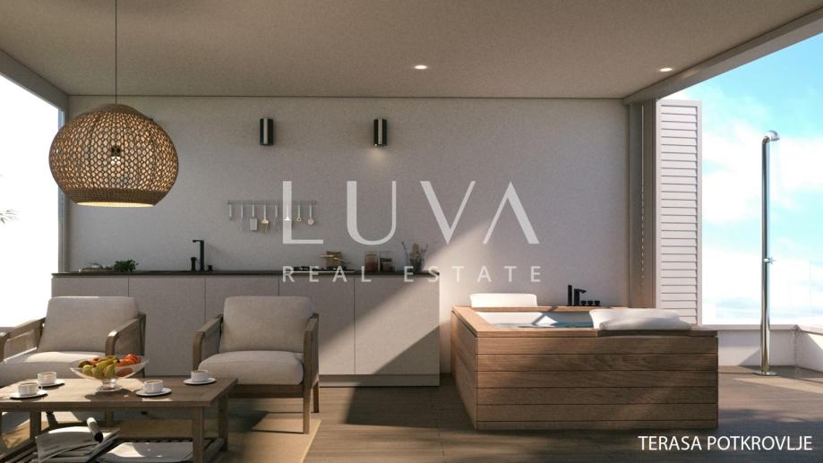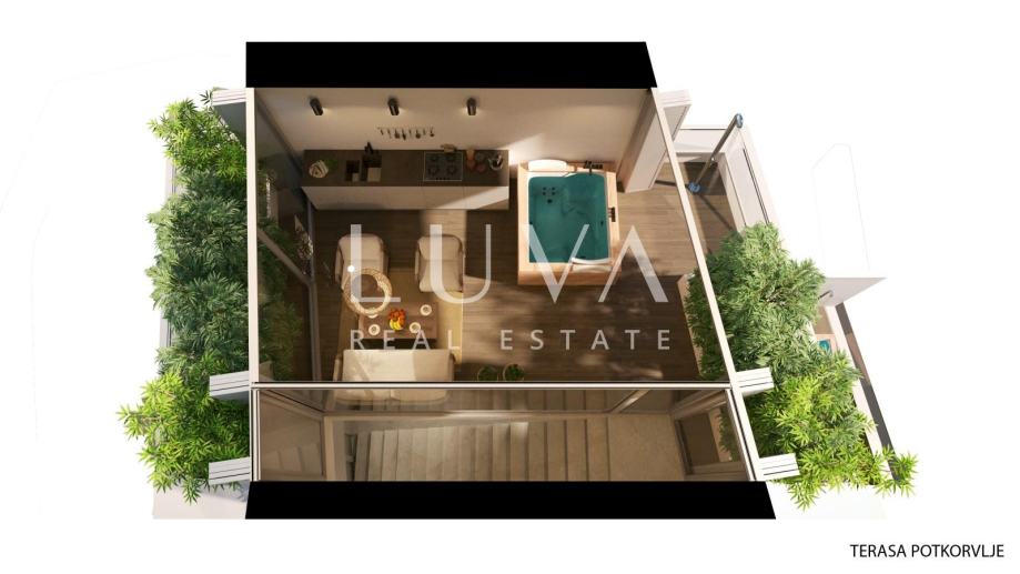 Etaža 4: loggia s funkcionalnom kuhinjom i prostorom za boravak/blagovanje obložena staklenim stijenama, vanjski tuš, zeleni krov, stubište.