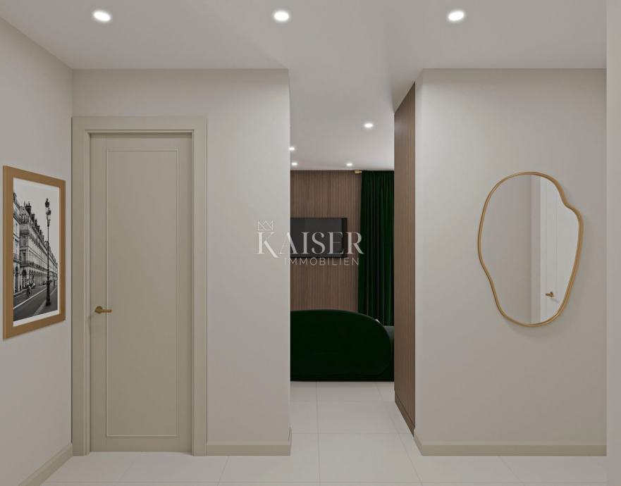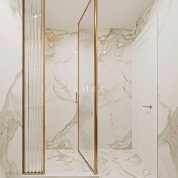 Stan se sastoji od prostrane spavaće sobe, dnevnog boravka, kuhinje s blagovaonicom, kupaonice, dodatnog gostinjskog WC-a, te dva odvojena balkona – oba s prekrasnim pogledom na more, što dodatno povećava osjećaj prostora i omogućuje svakodnevno uživanje u mediteranskom okruženju. Zgrada je u izgradnji te je predviđeni završetak radova do kraja 2025.godine. U ponudi je ukupno 8 stanova, pet jednosobnih i 3 dvosobna.