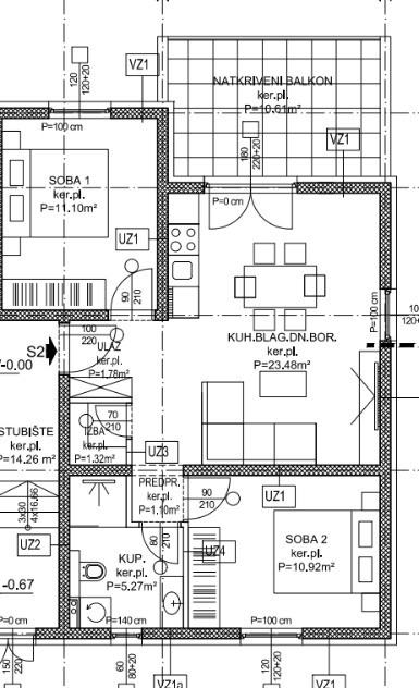 Stan se sasoji od dvije spavaće sobe, kupaonice, ostave unutar stana, open space dnevnog boravka, kuhinje i blagovaonice, te prostranog balkona. Stanu pripada jedno parkirno mjesto. Svaka prostorija u stanu imat će klima uređaj, a podno grijanje će biti kroz cijeli stan. Zbog položaja zgrade, svi stanovi imaju predivan pogled i omogućuju stanarima uživanje u panoramskim prizorima. Prostrani balkon idealan je za opuštanje i uživanje u pogledu na more i planine.