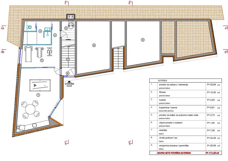 U podrumu posebna zvučno izolirana prostorija za druženje, teretana i vinski podrum/kušaonica.