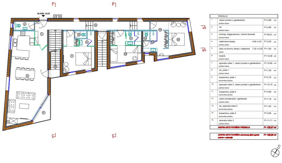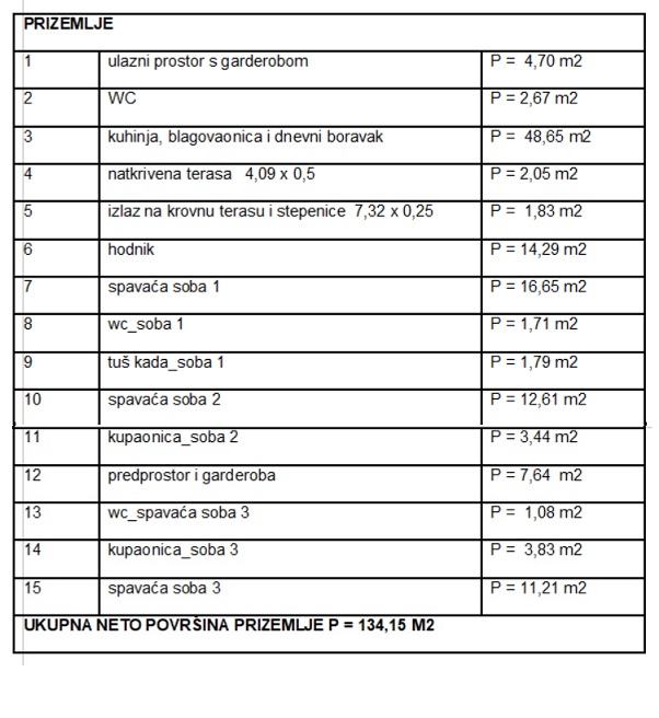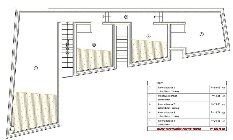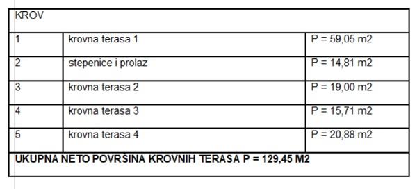 Ukupna neto površina zatvorenog dijela zgrade 245,6 m2, a krovnih terasa 129,45 m2.