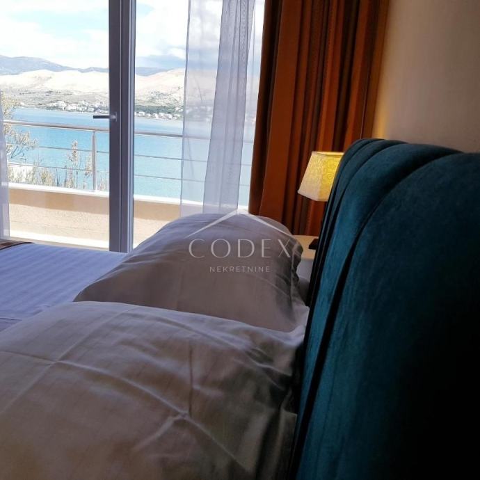 Na prvom katu nalazi se apartman veličine 75 m2 koncipiran kao jednosobni stan sa dnevnim boravkom, kuhinjom, blagovaonicom, kupaonicom te balkon koji se prostire na 3 strane vile te pruža impresivan pogled na stari grad Pag, Velebit i pašku uvalu. Uz apartman, na istoj etaži, nalazi se jedna dvokrevetna soba sa kupaonicom te dupla soba sa kupaonicom.