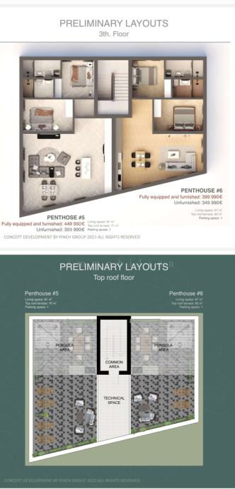 Svaka jedinica uključuje jedno privatno parkirno mjesto. Apartmani se isporučuju nenamješteni (399.990 €) ili potpuno namješteni i opremljeni (449.990 €), spremni za useljenje ili turistički najam.