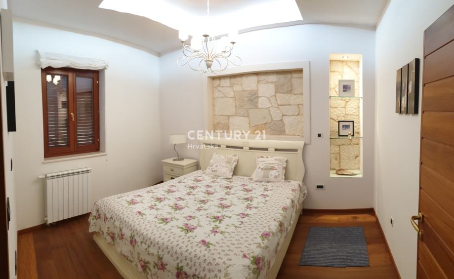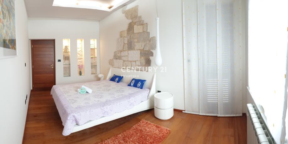 Vila se sastoji od tradicionalno uređene konobe i odmah do nje prostorije za relaksaciju sa sadržajima koji uključuju vrhunski jakuzzi i suhu saunu. Na etaži iznad je stan s tri spavaće sobe, dva kupatila, kuhinjom, blagovaonicom, dnevnim boravkom i natkrivenom terasom dok je na najvišoj etaži drugi stan s još dvije spavaće sobe kuhinjom, blagovaonicom, dnevnim boravkom i većom terasom. Te dvije dvije stambene jedinice imaju ukupnu korisnu neto površinu 402 m2, a ukupnu građevinsku bruto površine skoro 500 m2.