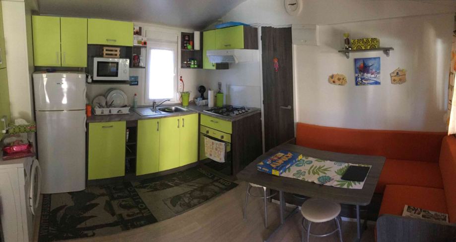 veći dnevni boravak s kuhinjom (perilica rublja, perilica posuđa, štednjak s pećnicom, mikrovalna pećnica, rastezljivi kauč, hladnjak, TV i blagovaonski kut s stolom)