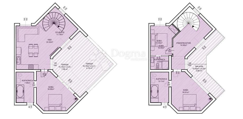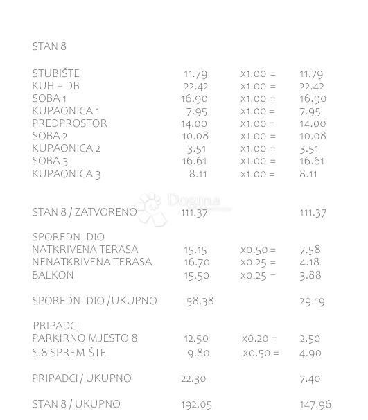 Ukupna brutto površina stana i pripadaka iznosi 192,05m2 odnosno 147,96m2 netto.