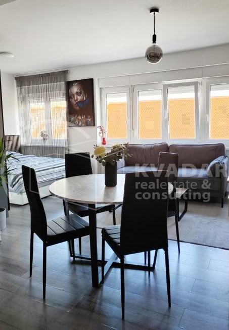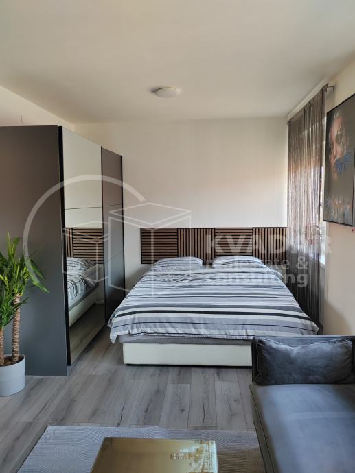 Stan se nalazi na petom katu stambene zgrade s liftom, odlikuje ga tlocrtno vrlo dobro iskorišten prostor koji se sastoji od ulaznog hodnika, dnevnog boravka s kuhinjom, spavaće sobe i kupaonice. Stanu pripada i spremište u podrumu, a prodaje se potpuno namješten.