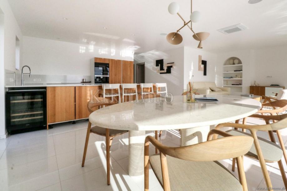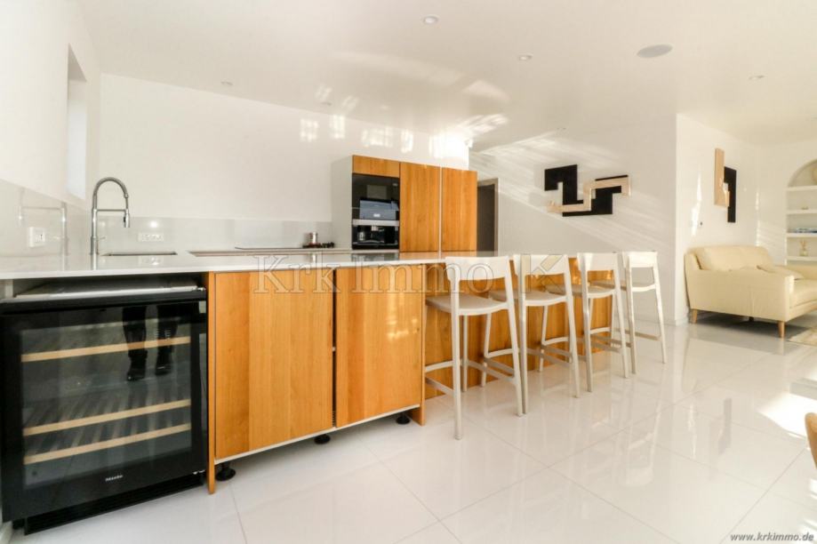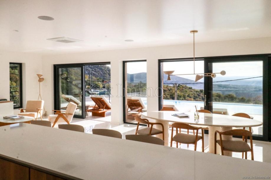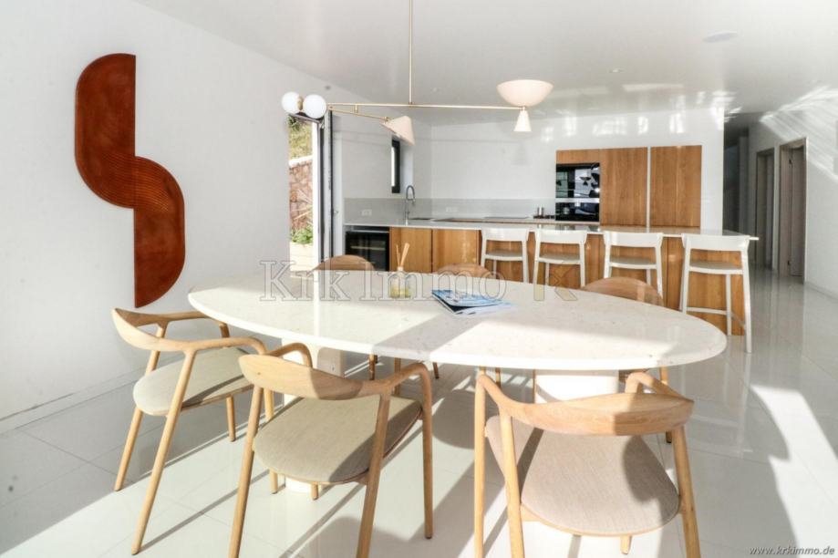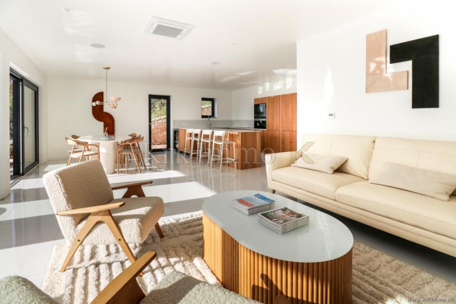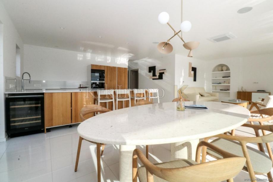 Centralni dio prizemlja je otvoreni prostor dnevnog boravka, blagovaonice i vrhunski opremljene kuhinje od bijelog iverala, s vratima elemenata od punog drva hrasta, s kvarcnom radnom površinom i Miele aparatima (2 ugradbena kombinirana hladnjaka, vinski frižider, perilica suđa, kuhalo, pećnica, mikrovalna, caffe aparat), ukupne dužine 9 metara. Iz dnevnog prostora se kroz velike staklene stijene izlazi na veliku natkrivenu terasu s grijanim preljevnim bazenom od 32 m² i sunčalištem.