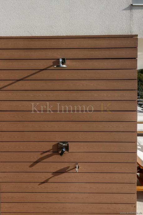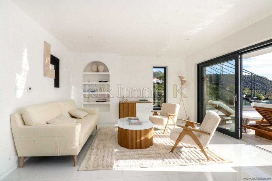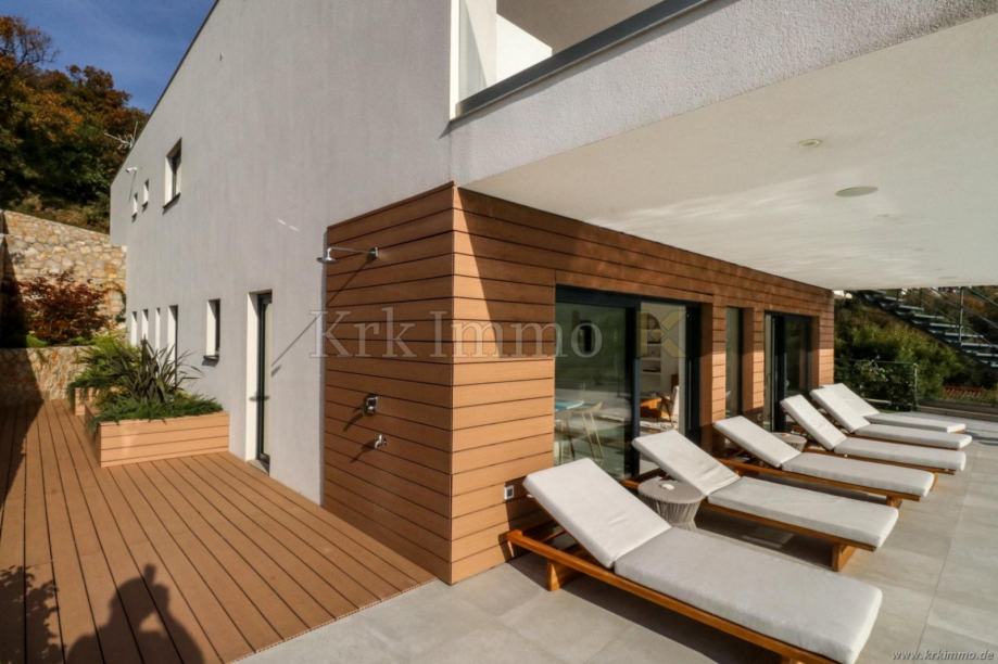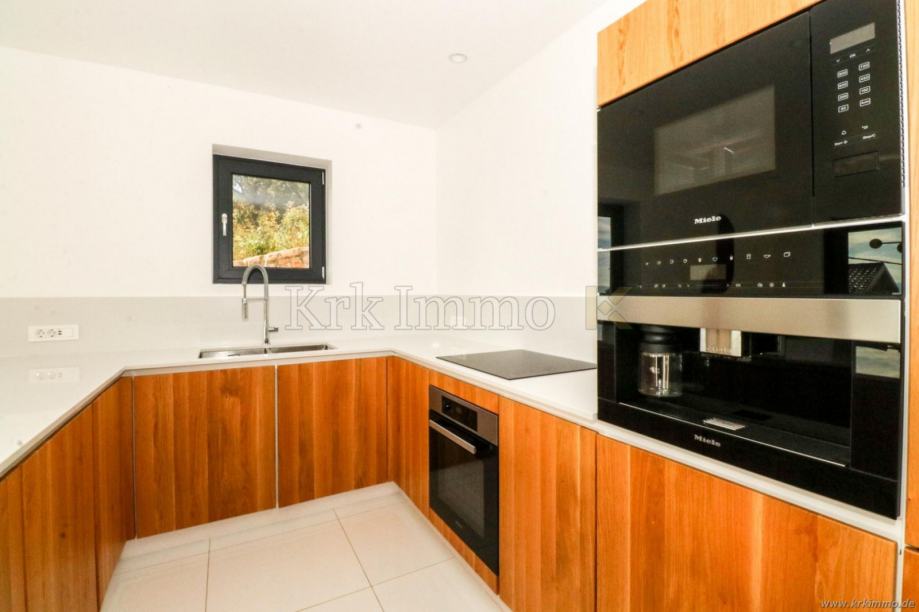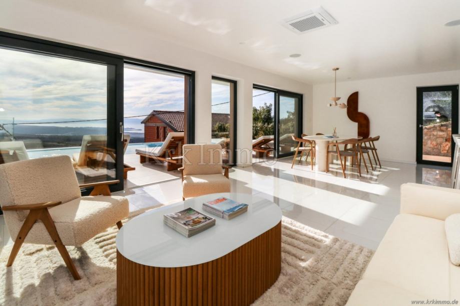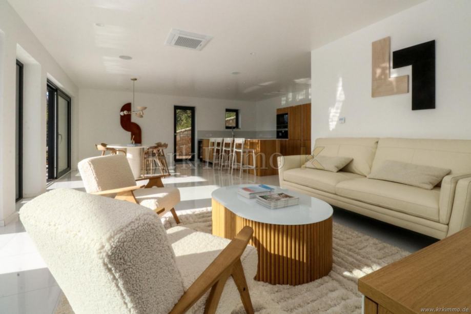 Centralni dio prizemlja je otvoreni prostor dnevnog boravka, blagovaonice i vrhunski opremljene kuhinje od bijelog iverala, s vratima elemenata od punog drva hrasta, s kvarcnom radnom površinom i Miele aparatima (2 ugradbena kombinirana hladnjaka, vinski frižider, perilica suđa, kuhalo, pećnica, mikrovalna, caffe aparat), ukupne dužine 9 metara. Iz dnevnog prostora se kroz velike staklene stijene izlazi na veliku natkrivenu terasu s grijanim preljevnim bazenom od 32 m² i sunčalištem.