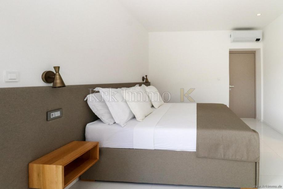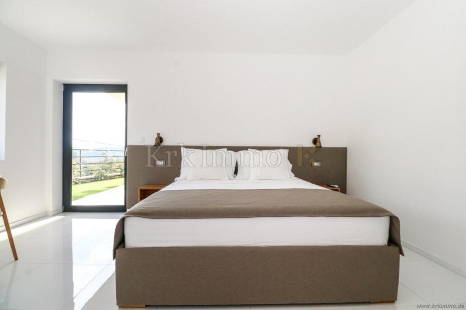 Na prvi kat vode unutarnje stepenice, gdje su smještene dvije spavaće sobe s vlastitim kupaonicama, od kojih jedna ima vlastiti balkon. Katom dominira otvoreni lounge prostor za druženje opremljen sa custom-made biljarskim stolom, 2 TV-a, projektorom i platnom te potpuno opremljenim barom od lakiranog medijapana opremljenim ugradbenim frižiderom, perilicom posuđa Miele i točionikom s 4 nastavka. Velike pomične staklene stijene pružaju puno svijetlosti i izlaz na veliku terasu s panoramskim pogledom na more. Terasa ima i vanjsku kuhinju, lounge dio opremljen namještajem od tikovine, i povezana je vanjskim stepenicama s okućnicom tj. prizemljem i grijanim preljevnim bazenom.