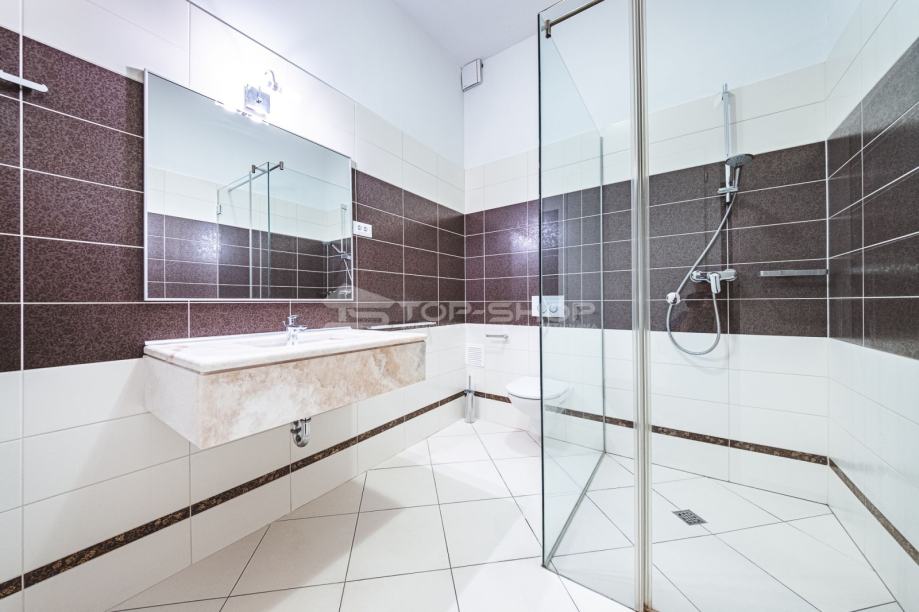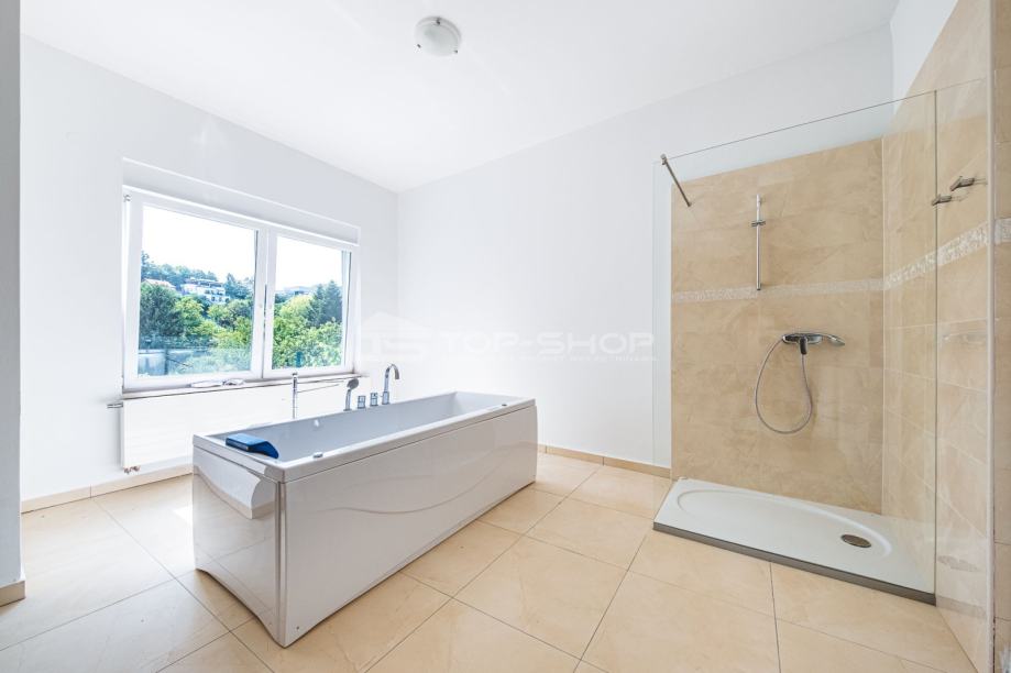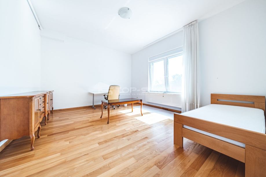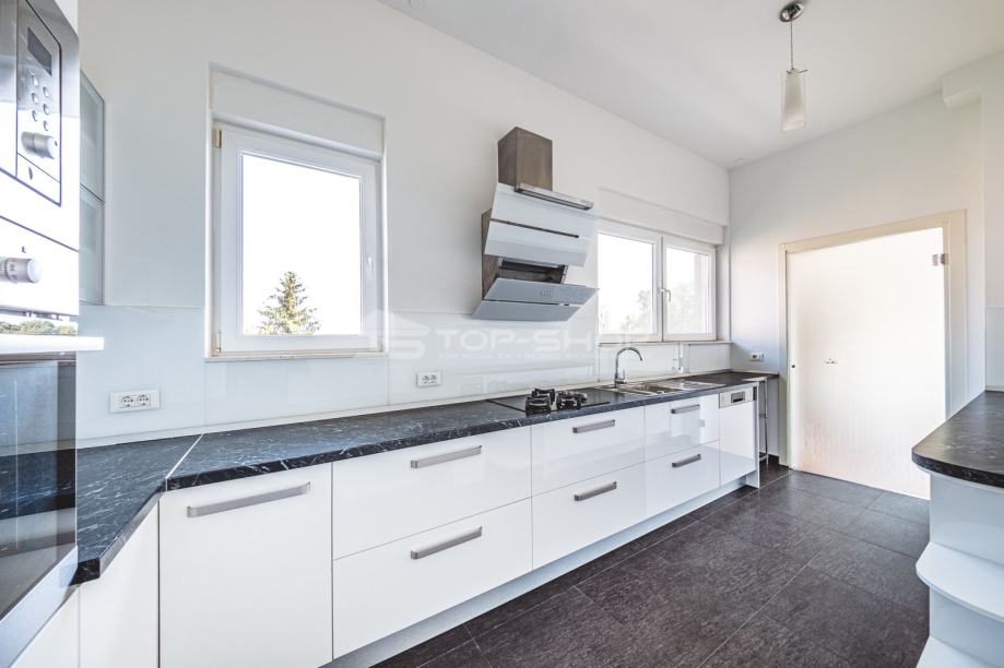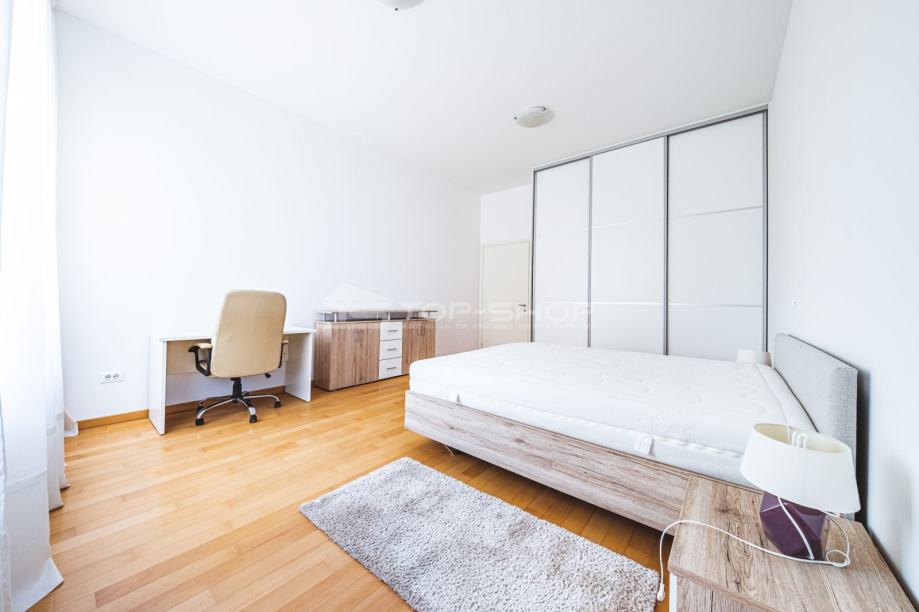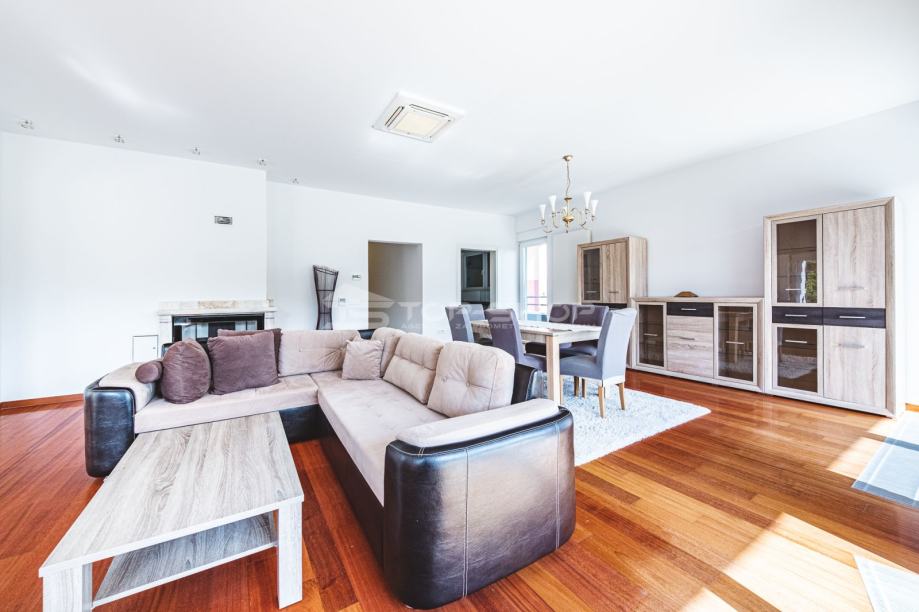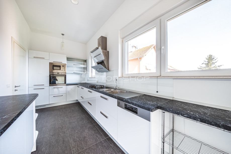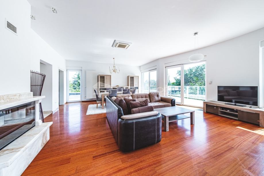 Sastoji se od: ulaznog hodnika u kojem se nalazi lift s kojim se može ući direktno u stan, prostrani dnevni boravak s kaminom i blagovaonicom te izlazom na dva balkona i prekrasnu terasu s koje se pruža pogled na Grad Zagreb i zelenilo, kompletno opremljene kuhinje, 4 spavaće sobe s ugradbenim ormarima(dvije spavaće sobe imaju vlastitu kupaonicu s toaletom i tušem), jedne velike prostorije s kadom i tušem, dvije kupaonice s toaletom, izdvojeni toalet, vešeraj, velika ostava.