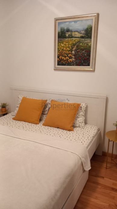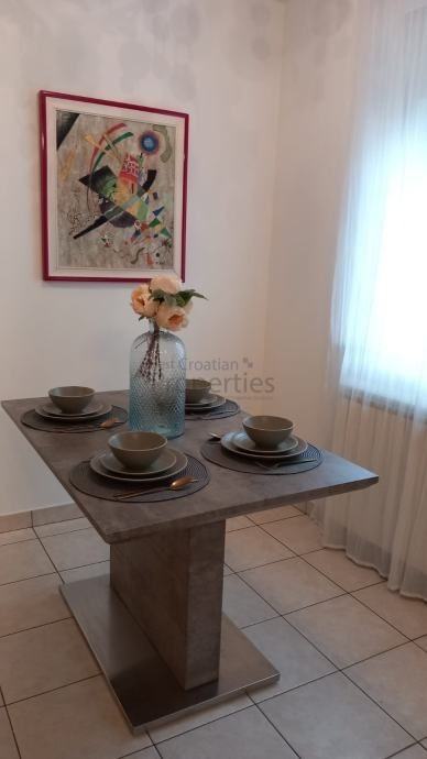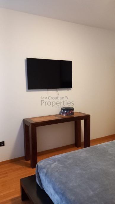 Opremljen je svim potrebnim aparatima (klima uređaj, hladnjak s ledenicom, protuprovalna vrata, električne rolete, video portafon, perilica posuđa, perilica rublja...)