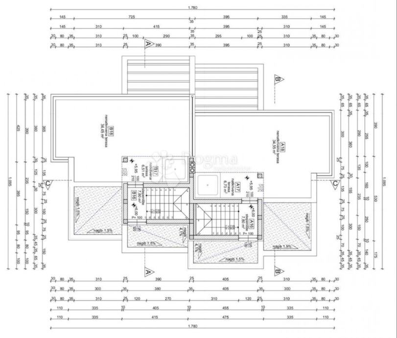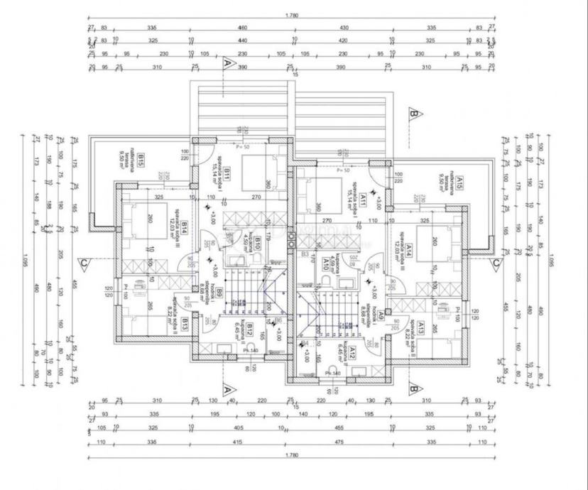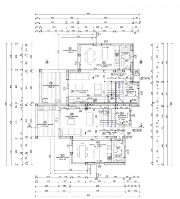 Tlocrtna bruto površina cijele nekretnine je 279m2, dok je za jednu jedinicu određeno 140m2. Katnost P+2.