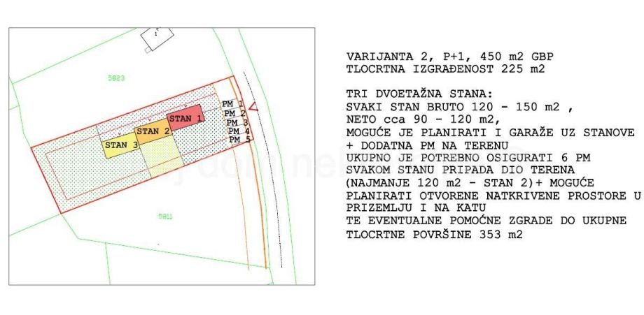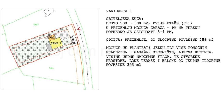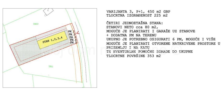Među fotografijama u oglasu su neke od mogućih varijanti gradnje prema novom GUP-u (napomena: na čestici je moguće planirati i veću gradnju od prikazanih, uz poštivanje udaljenosti od međa h/2 i katnosti do - podrum, prizemlje, 2 kata i uvučeni kat ili potkrovlje).