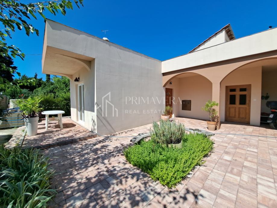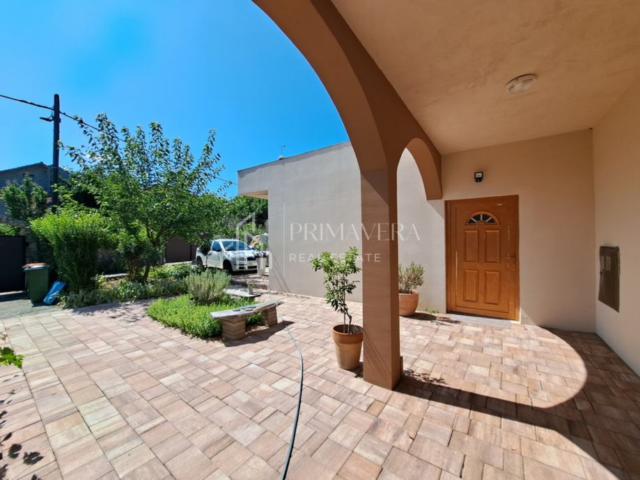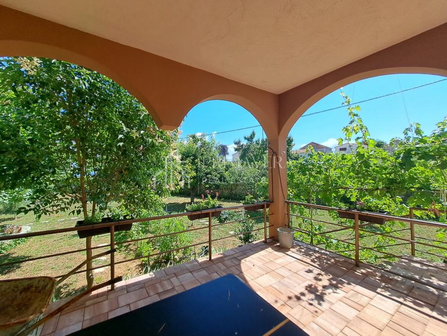 Parking se nalazi u potpuno ograđenom dvorištu. Prostrana okućnica na kojoj se kuća nalazi, ukupne površine 1015 m2 nudi brojne mogućnosti uređenja, a čak i mogućnost izgradnje dodatnog objekta. Kuća se nalazi u centru mjesta u neposrednoj blizini lijepe plaže, igrališta, trgovine i ugostiteljskih objekata.