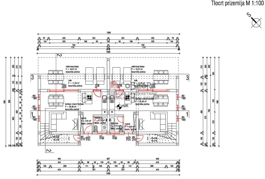 1. prizemlje: kuhinja s blagavaonom i dnevnim boravkom, hodnik, toalet, lođa, spremište i natkrivena terasa.