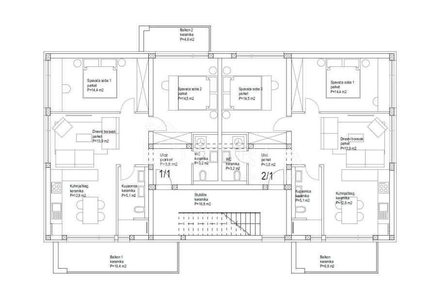 Na prvom katu i drugom katu se nalaze dvosobni stanovi.