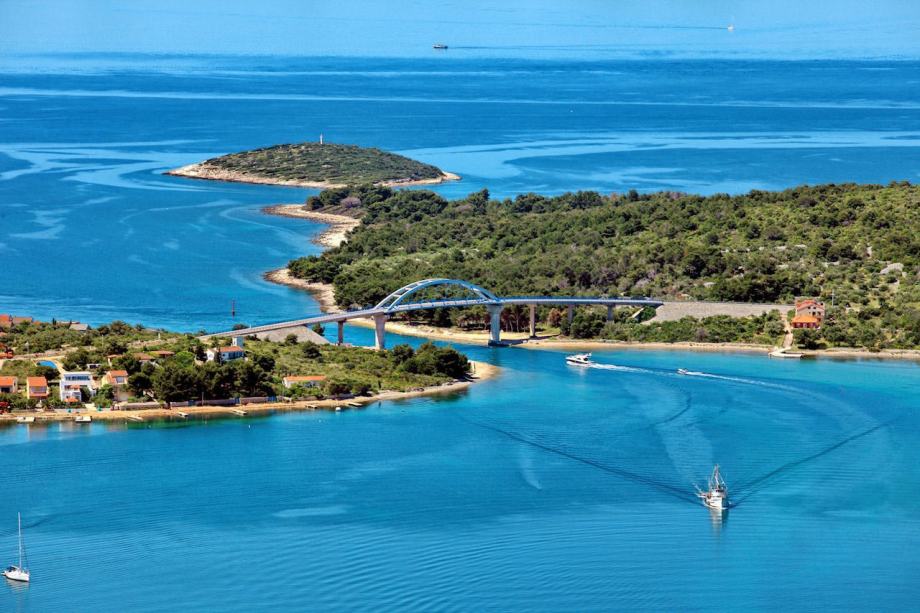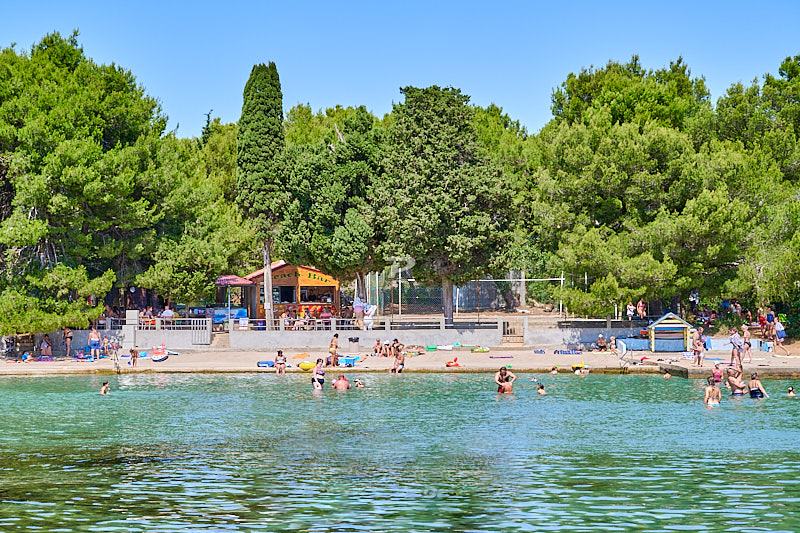 Nalazi se svega 110 metara od obale i 300 metara od centra naselja, gdje se nalazi trgovina, gostionica i mol za privez čamaca.