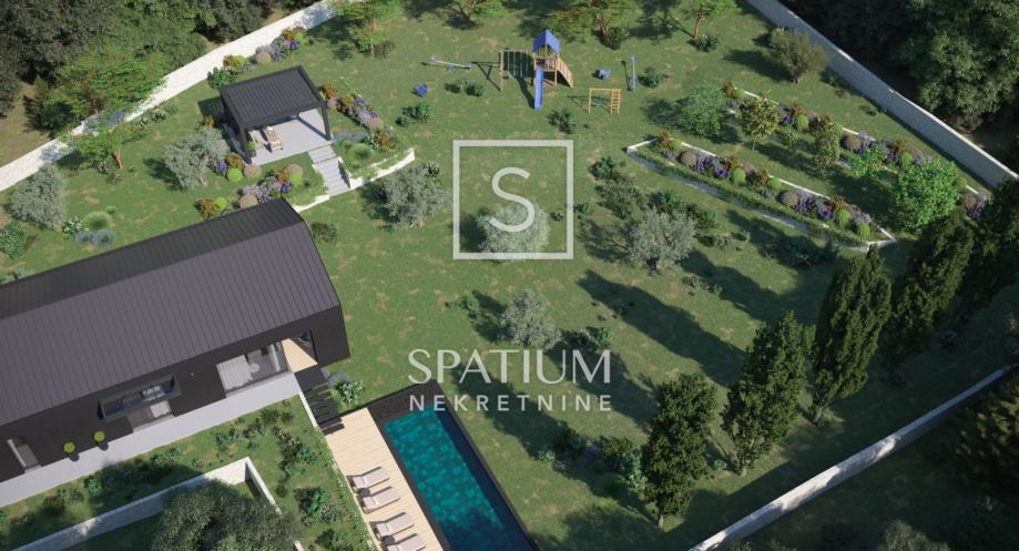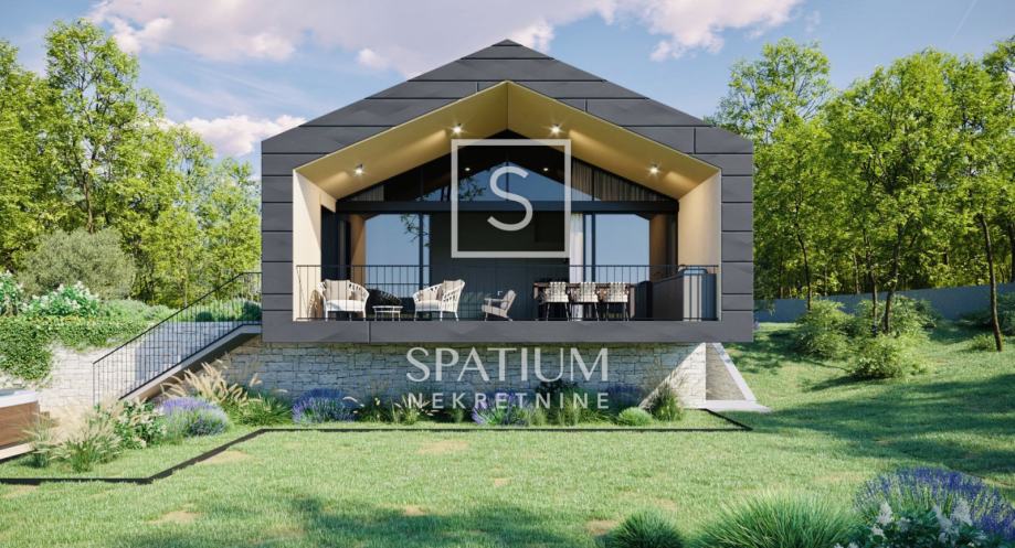 PAZIN, KUHARI, u ponudi je zemljište s građevinskom dozvolom za izgradnju kuće s bazenom. Projektom je zamišljeno da se prizemnica sa suterenskim prostorom spremišta smjesti na 2766 m2 zemljišta pri čemu uz popratni sadržaj kao što su bazen, sunčalište s jacuzzijem, terasa s ljetnom kuhinjom i prostorom za druženje, još uvijek ima dovoljno prostora za parking više vozila i za uređenje zelenih kaskadnih vrtova.
