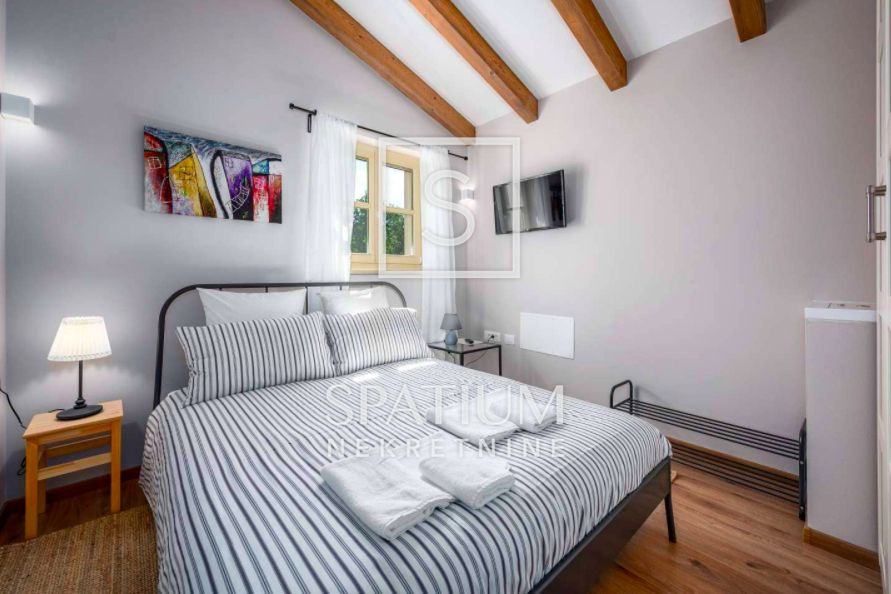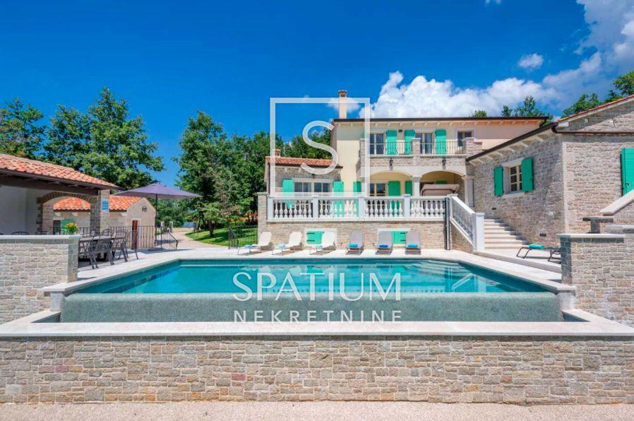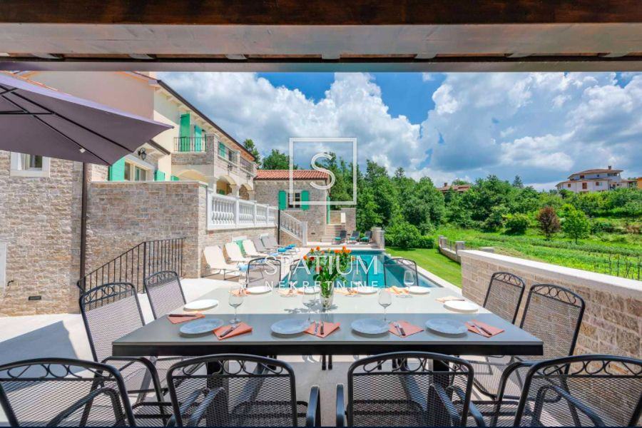 PAZIN, u ponudu smo dobili ovu prekrasnu kamenu vilu izgrađenu u toskanskom stilu koja se smjestila u središnjoj Istri, u jednom od najnetaknutijih krajolika Europe. Plijeni svojom veličinom i stilom, rustikalnom gradnjom i opremom. Mediteranska arhitektura koja kombinira ručno obrađen kamen, građevinske materijale koji se uklapaju u okoliš te moderna oprema, čine ovu kamenu vilu jedinstvenom. Prizemlje se sastoji od kuhinje, blagovaonice, dnevnog boravka sa kaminom, WC-a za goste, dvije spavaće sobe, jedne kupaonice, ostave/spremišta i nekoliko terasa. Na prvom katu nalaze se tri spavaće sobe i dvije kupaonice. Vila također ima samostojeći objekt koji se koristi kao konoba sa kuhinjom, kaminom, prostorom za blagovanje i WC-om za goste. Vanjski prostor može se pohvaliti preljevnim bazenom, prostranom terasom za sunčanje s ležaljkama, kao i blagovaonicom na otvorenom. Ova vila ima ukupnu izgrađenu površinu od 305 m2, od čega je interijer 226 m2, terase 39 m2 i bazen 40 m2, na zemljištu od 3.200 m2. Ova nekretnina je dobro pozicionirano kao baza iz koje možete posjetiti sve čari koje Istra nudi.