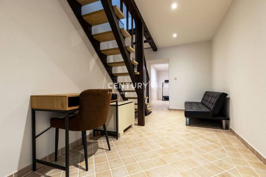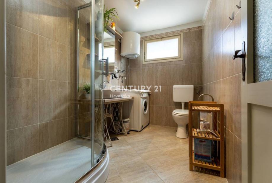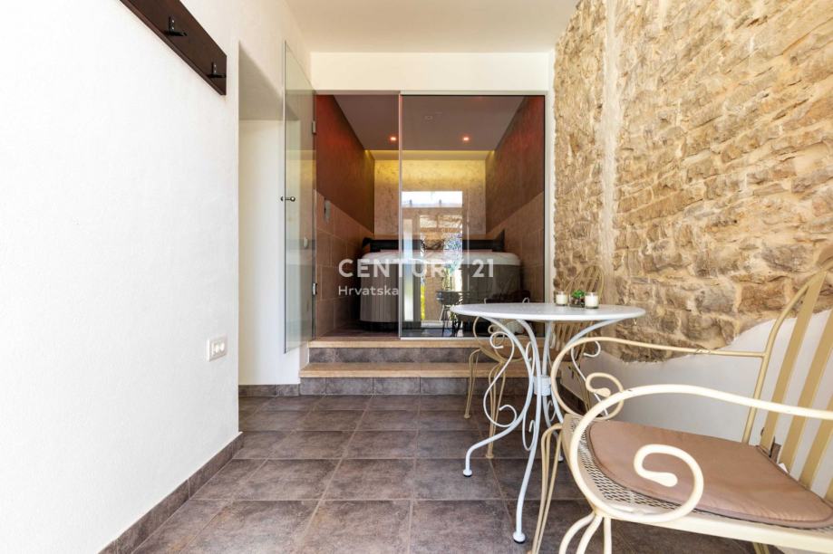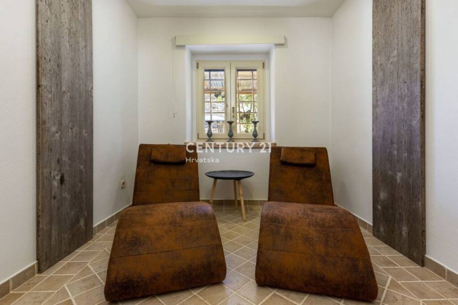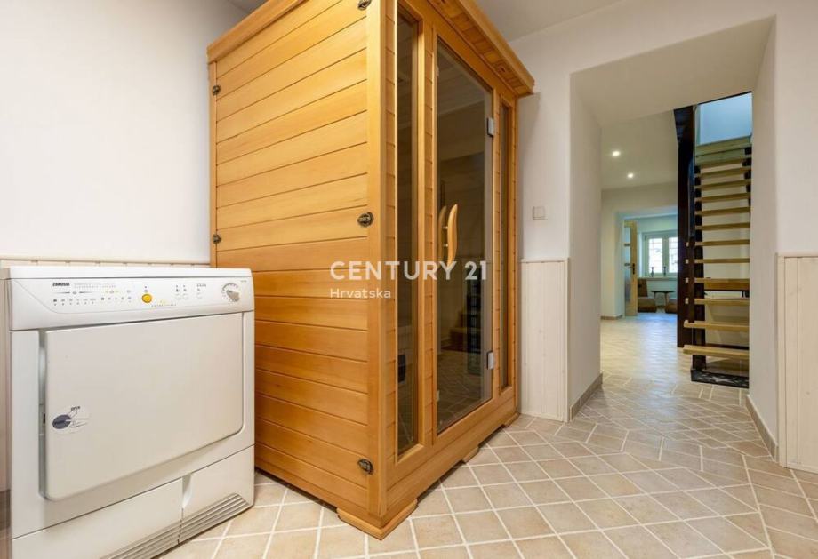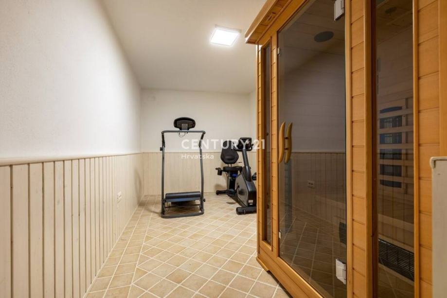 Stepenicama se silazi u konobu gdje se nalaze wellness prostorije, odnosno teretana, sauna i jacuzzi. Također, iz tih se prostorija izlazi u vrtnu okućnicu veoma lijepo uređenu s jacuzzijem i prostorom za roštiljanje.
