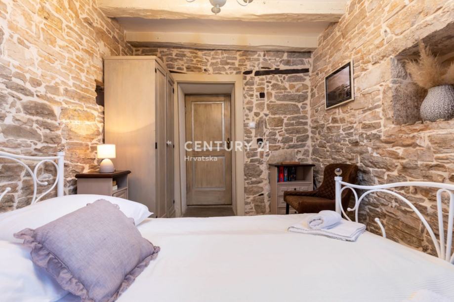 Iz prizemlja se stepenicama dolazi na kat gdje se nalaze dvije spavaće sobe od kojih jedna ima izlaz na terasu i kupaonice.