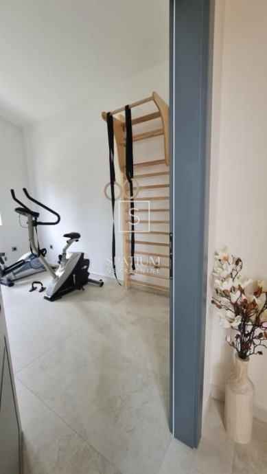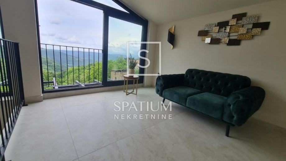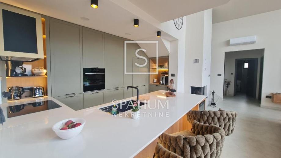 PAZIN, u ponudu smo dobili vilu s bazenom stambene površine 230 m2 i okućnicom 1417 m2 s maslinikom. U prostranom prizemlju nalaze se tri spavaće sobe, od kojih svaka ima svoju kupaonicu. Prva etaža sastoji se od open space dnevnog boravka, kuhinje i blagovaonice s kliznim stijenama koje omogućuju izlaz na dvorište i vanjsku blagovaonicu, a veliki prozori ispunjavaju prostor prirodnim svjetlom. Iz dnevnog boravka stepenice vode na drugu etažu koja sadrži otvoreni hodnik iz kojeg se pruža pogled na dnevni boravak, vanjski bazen i zelene brežuljke. Na ovoj etaži nalazi se četvrta spavaća soba koja ima svoju kupaonicu i izlaz na privatnu terasu. U vanjskom dijelu posebno se izdvaja "Infinity" bazen koji se savršeno uklapa u prirodni ambijent. Osim bazena, tu je i prostor za opuštanje u obliku otoka te dječje igralište. Objekt također raspolaže dodatnim toaletom i teretanom. Interijer je opremljen ručno izrađenim, visokokvalitetnim namještajem po mjeri, koji odražava profinjen stil i pažnju prema detaljima. Sustav grijanja/hlađenja omogućen je putem podnog grijanja, osam klima uređaja i kamina na drva. Na okućnici se nalaze natkrivena parkirna mjesta za tri vozila. Cijela okućnica je ograđena i osvijetljena što jamči privatnost i sigurnost. Ovo je izvrsna nekretnina za one koji žele uživati u mirnom okruženju, a ujedno je i prilika za bavljenje turističkom djelatnošću.
