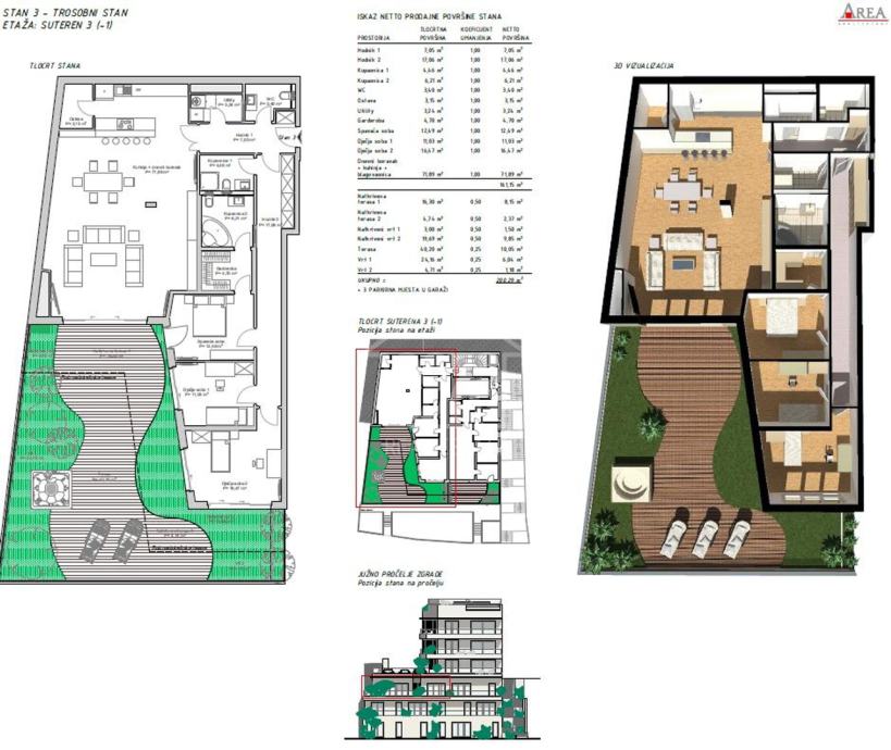 Stan 3 = 161,1 m2/suteren 3 (-1), trosobni stan sa dnevnim boravkom, dvije kupaonice i terasom od 112,28 m2 + 3 garažna parkirna mjesta (2 x 35.000 EUR, 1x40.000EUR), "KUĆA U KUĆI"