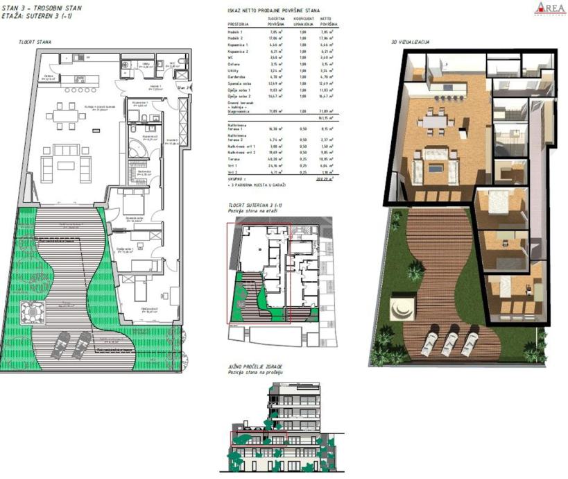 stan 3/suteren 3 (-1) = 161,10 m2 + terasa 112,28 m2 + 3 garažna parkirna mjesta